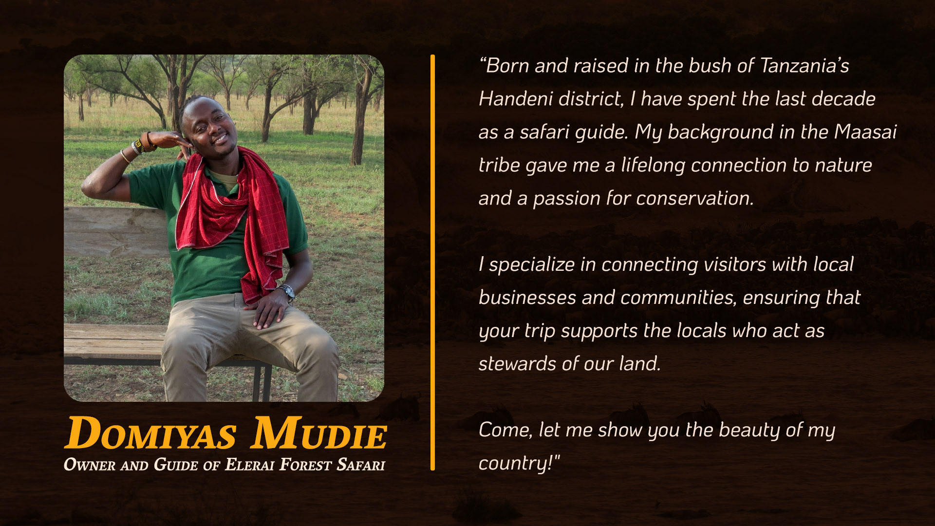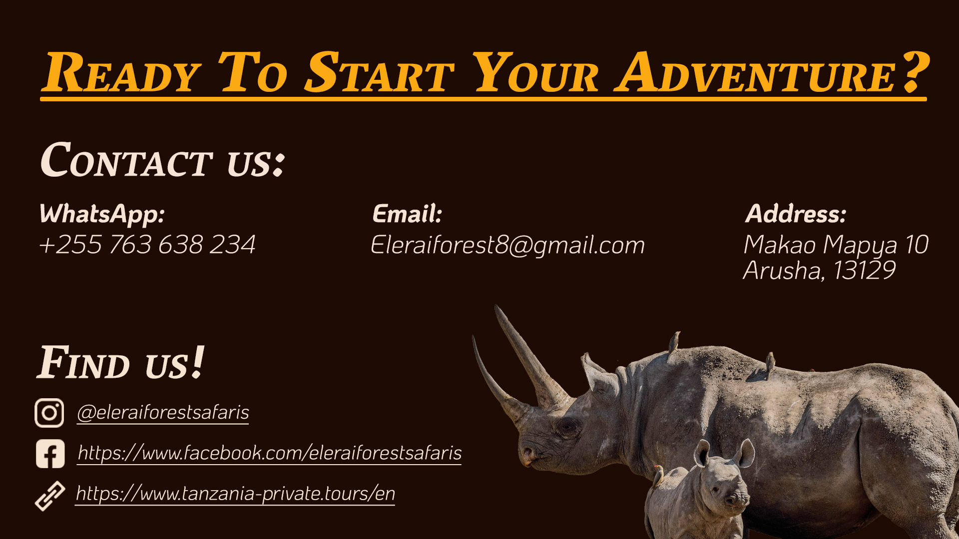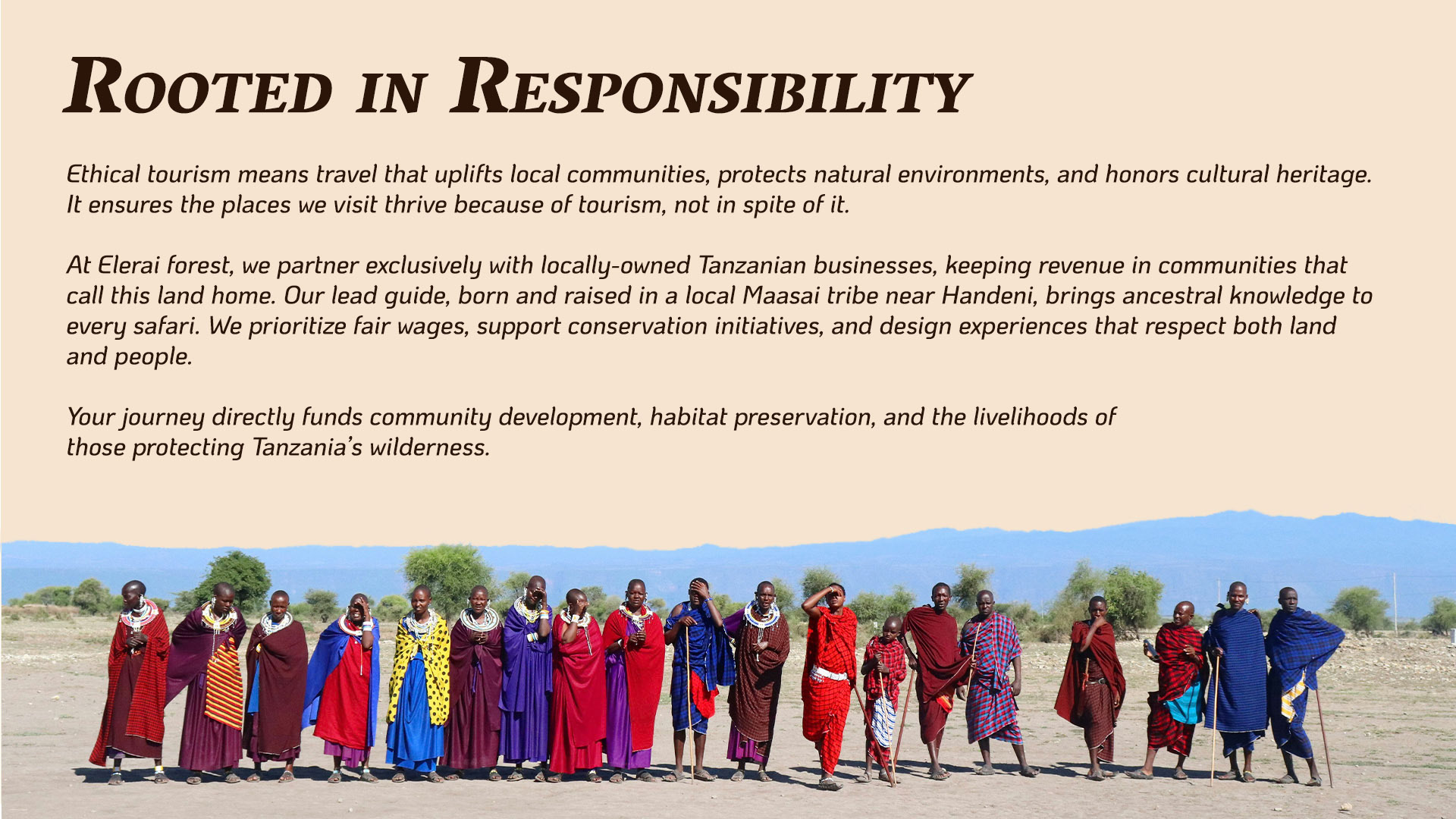 A comprehensive digital brochure for Elerai Forest Safari, a locally-owned Tanzanian safari company committed to ethical tourism and community support.