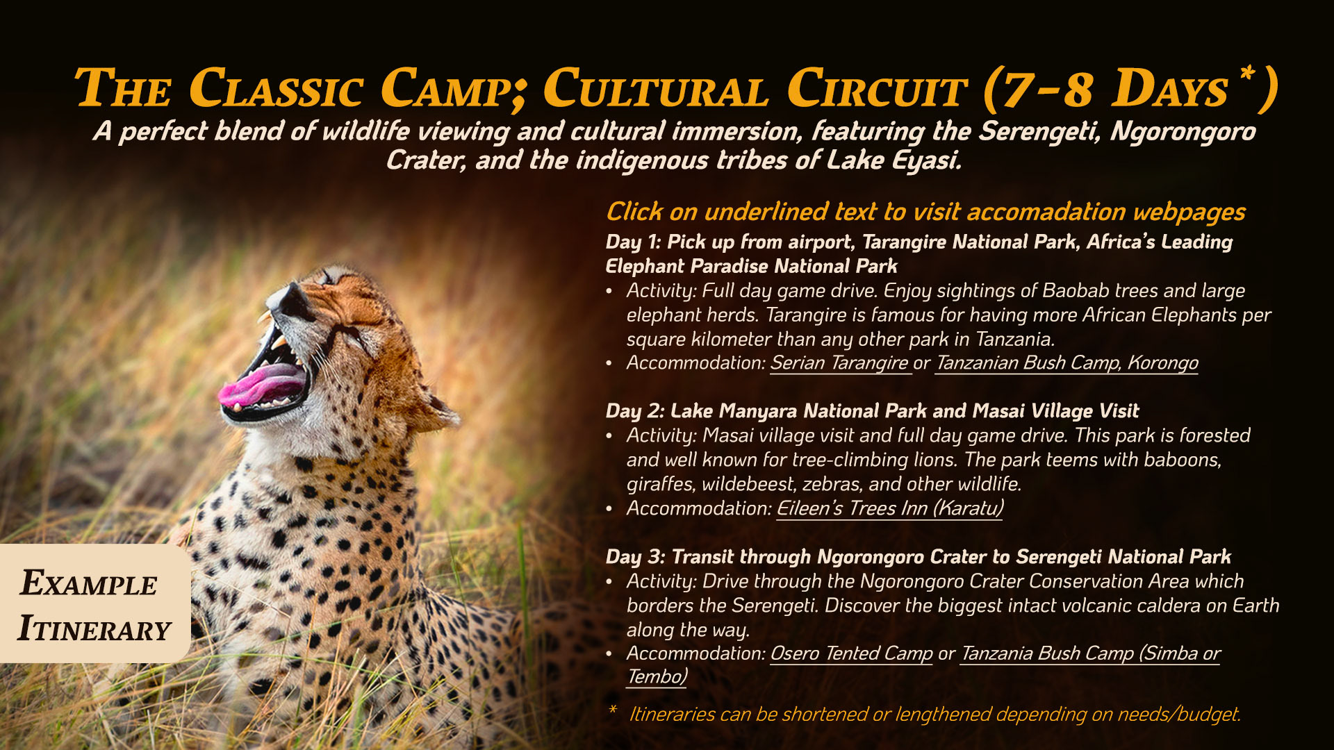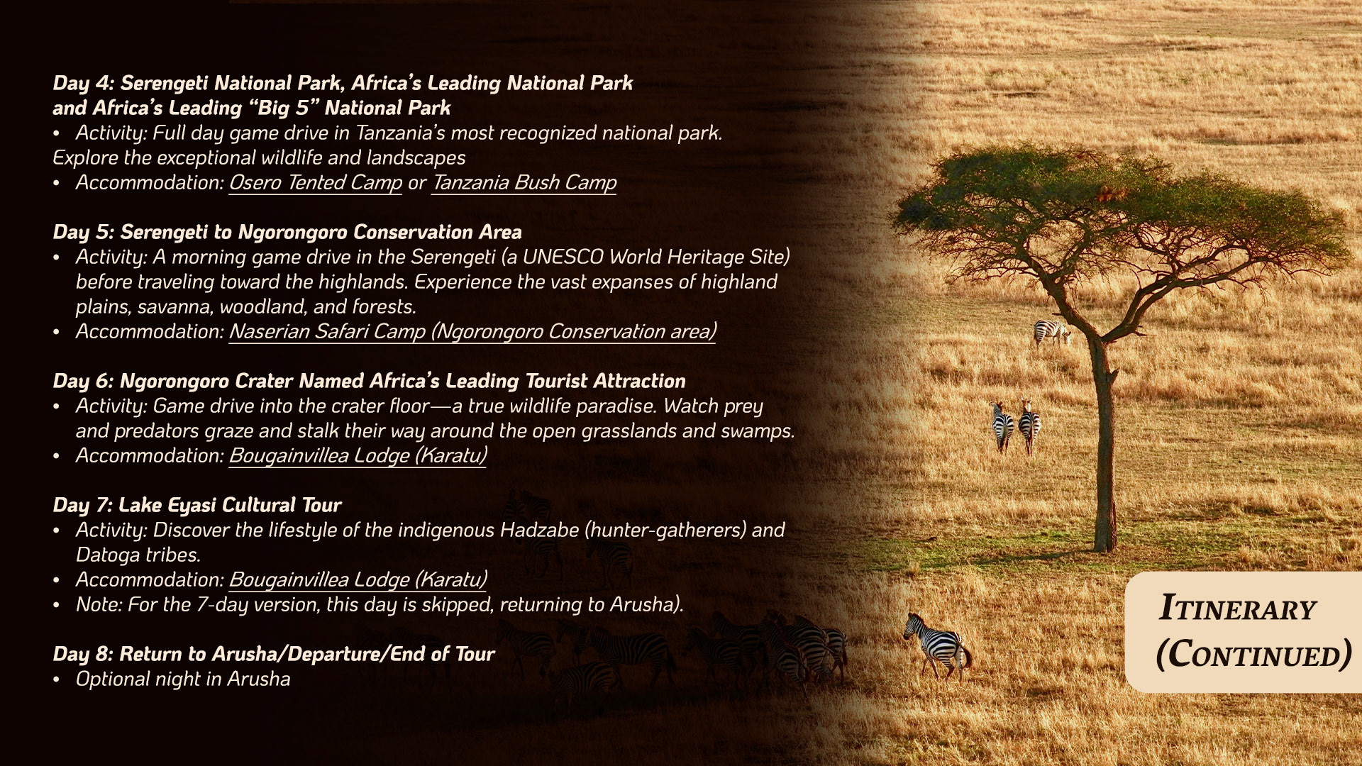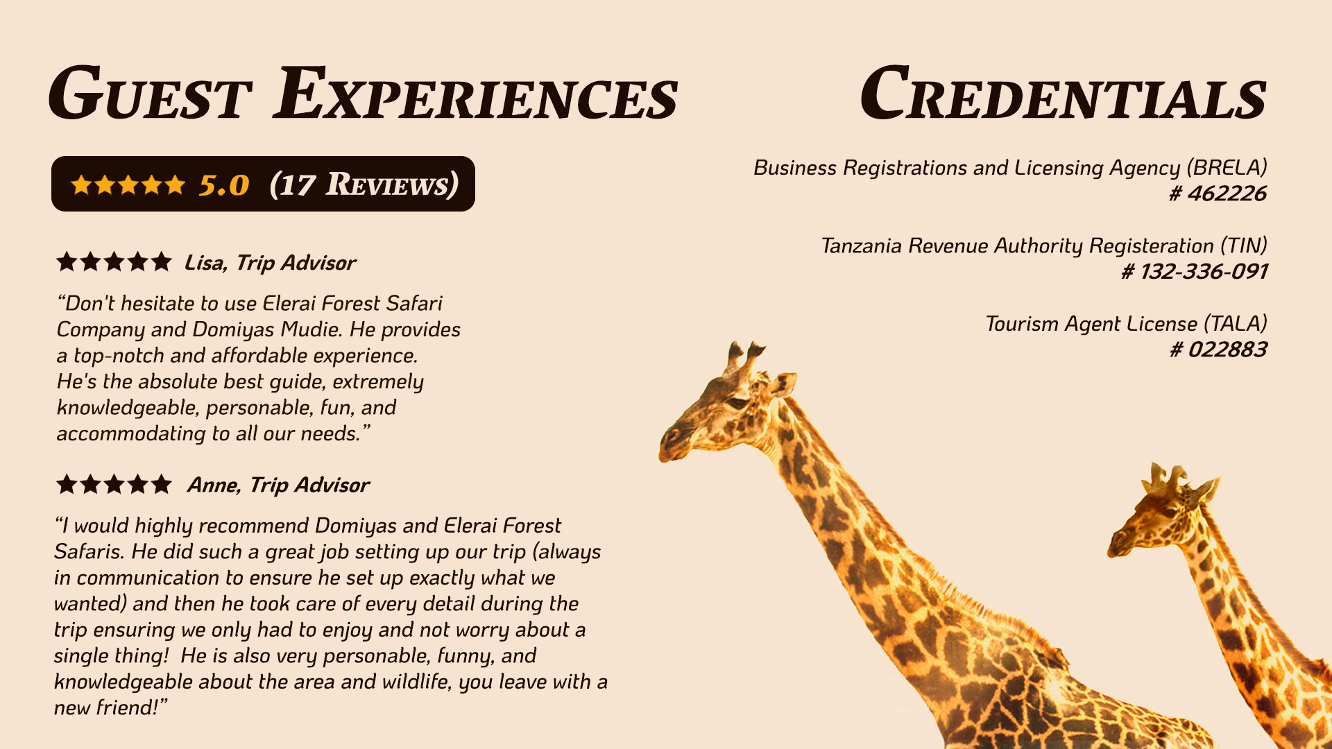 A comprehensive digital brochure for Elerai Forest Safari, a locally-owned Tanzanian safari company committed to ethical tourism and community support.
