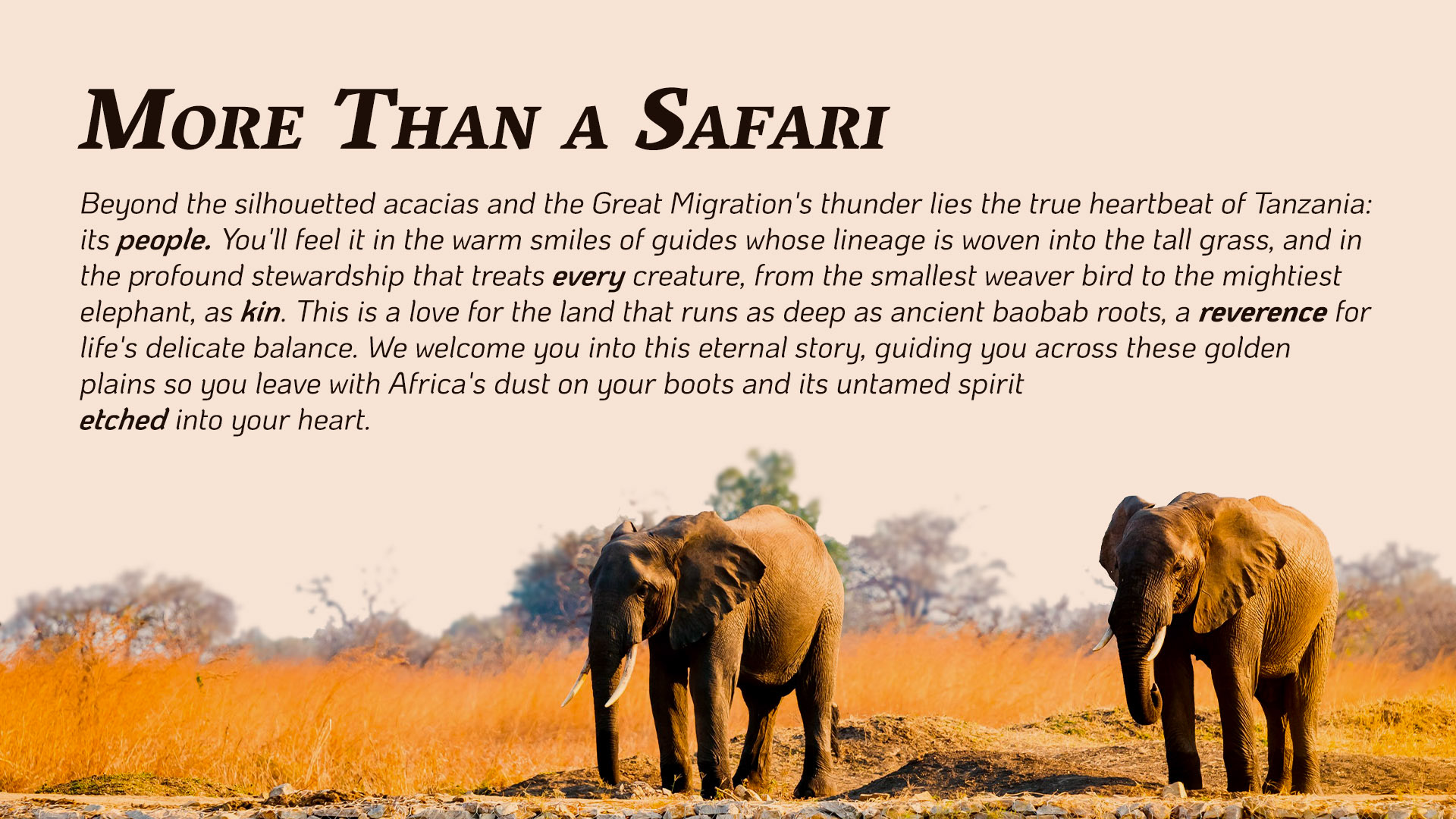 Design Approach: Created an immersive visual experience that reflects both the premium nature of the safari experience and the company's authentic commitment to ethical practices. The design language honors Tanzania's natural beauty while establishing Elerai as a trustworthy, values-driven tourism provider.